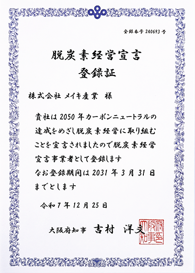 当社は、2050年カーボンニュートラルの実現を目指し、【脱炭素経営宣言】を行い、脱炭素経営宣言事業者として登録されました。 今後も環境負荷低減に向けた取り組みを継続し、持続可能な社会の実現に貢献してまいります。 (登録期間:2031年3月31日まで)